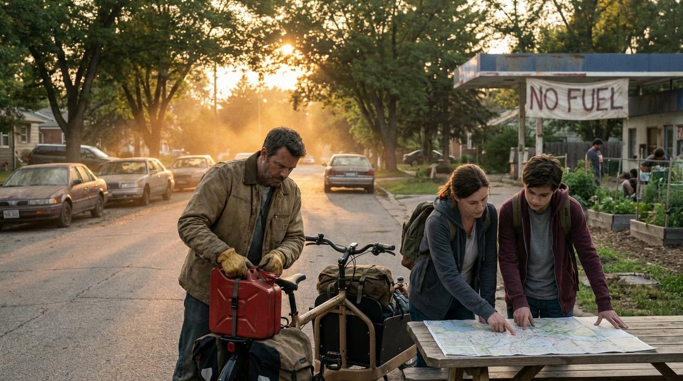Fuel shortages preventing vehicle use and public transit disruption. Requires fuel storage, alternative transportation, and local resource mapping.