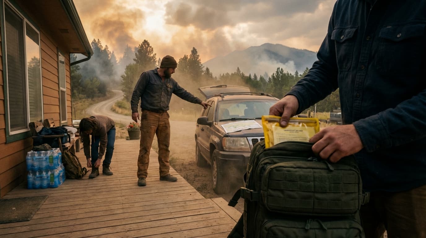 Emergency evacuation with minimal preparation time. Requires go-bags, evacuation routes, rally points, and important document protection.