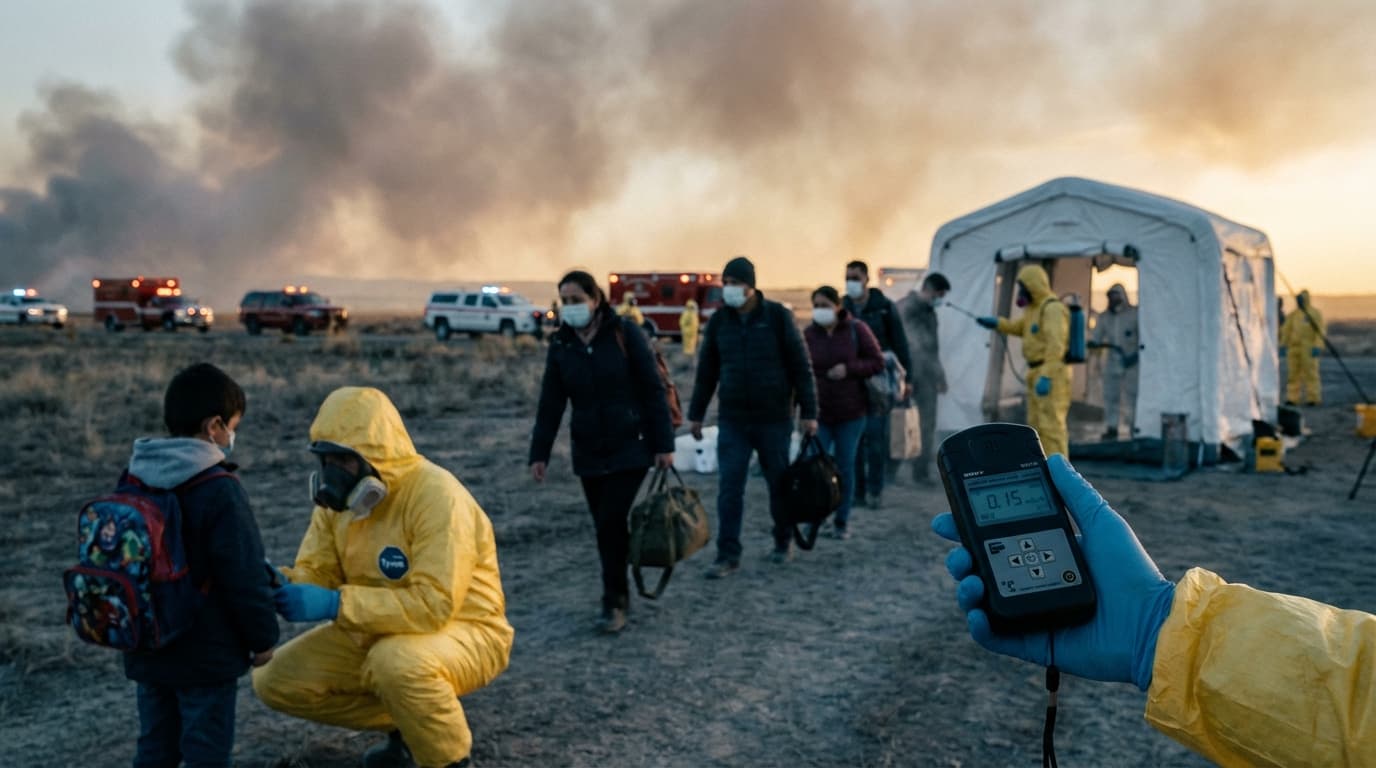 A nuclear incident, dirty bomb, or radiological emergency. Focus on radiation protection, evacuation, and decontamination procedures.